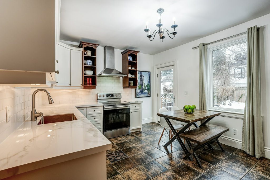The eat-in kitchen features high-end porcelain counters, stainless steel appliances, tons of cupboards and so much space to prep a meal. It is the perfect place to enjoy a family dinner or cook for a crowd! Step outside the backdoor and you are greeted with a fully fenced-in backyard that is quiet and private – ready for you to enjoy a lovely morning coffee or an evening relaxing.