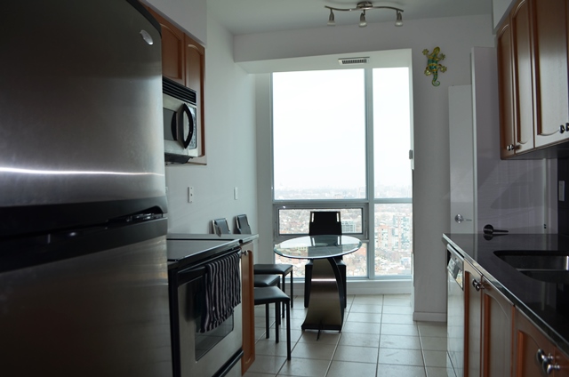 The vistas aren’t the only fantastic features of this penthouse. The kitchen has beautiful granite counters, stainless steel appliances and a large eat-in area. The bedrooms are both large and have mirrored (and also large) closets. On top of that they are ideally located away from each other at either sides of the suite! The open concept Living and Dining Rooms have hardwood flooring and huge windows all around.